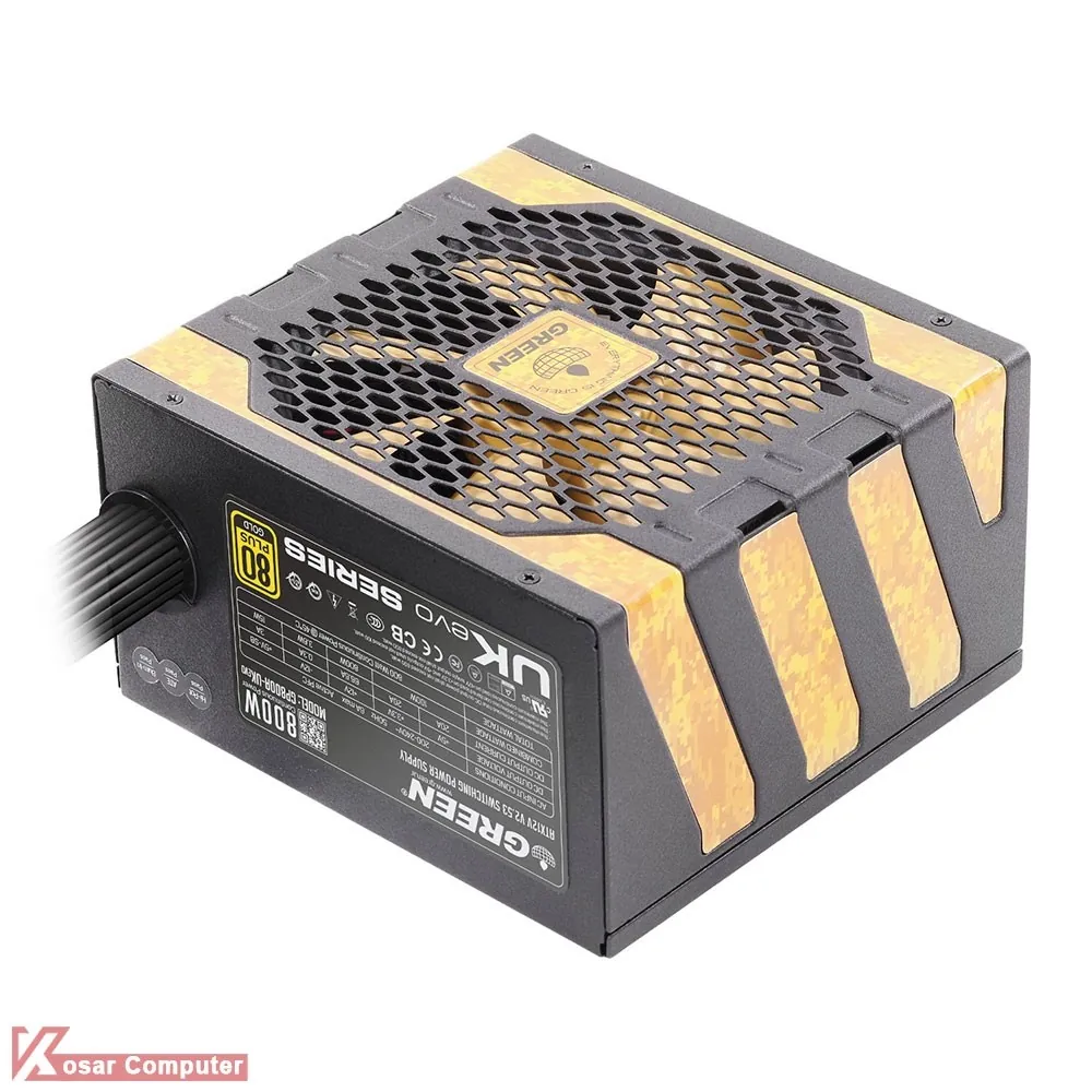 پاور گرین مدل GP800A-UK EVO GOLD دارای 800 وات توان می باشد و به صورت غیر ماژولار است.در این پاور یک عدد کانکتور مادربرد 4+20 پین ، دو عدد کانکتور برق پردازنده 4+4 پین ، چهار عدد کانکتور برق 2+6 PCI-e ، چهار عدد کانکتور 4پین Molex و هشت عدد کانکتور SATA م