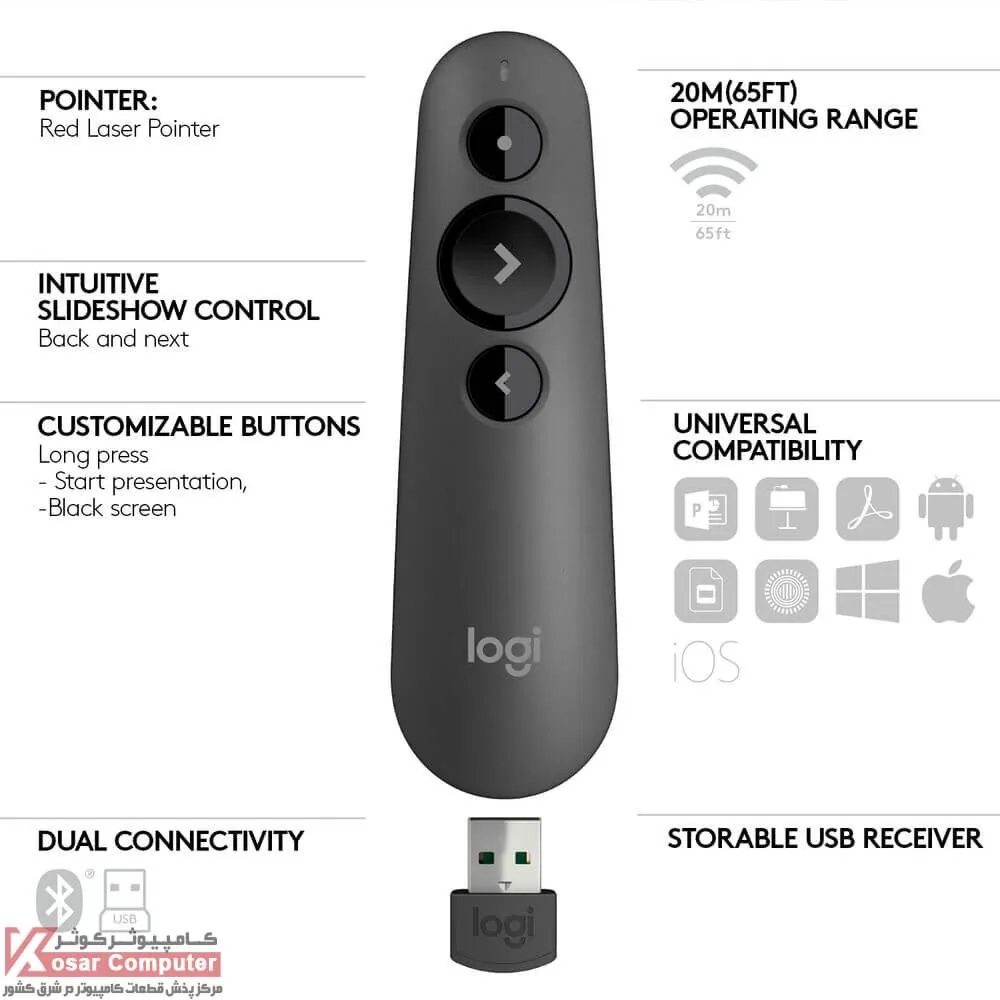 پرزنتر لاجیتک مدل R500 به صورت بیسیم (وایرلس) به سیستم متصل شده و طوری طراحی شده تا شما خیلی راحت پروژه یا هدف خود را به سایرین ارائه کنید.همچنین دارای اشاره گر لیزری قرمز رنگی است که می توانید توسط آن قسمتی که به آن اشاره دارید را به راحتی به حضار نشان..